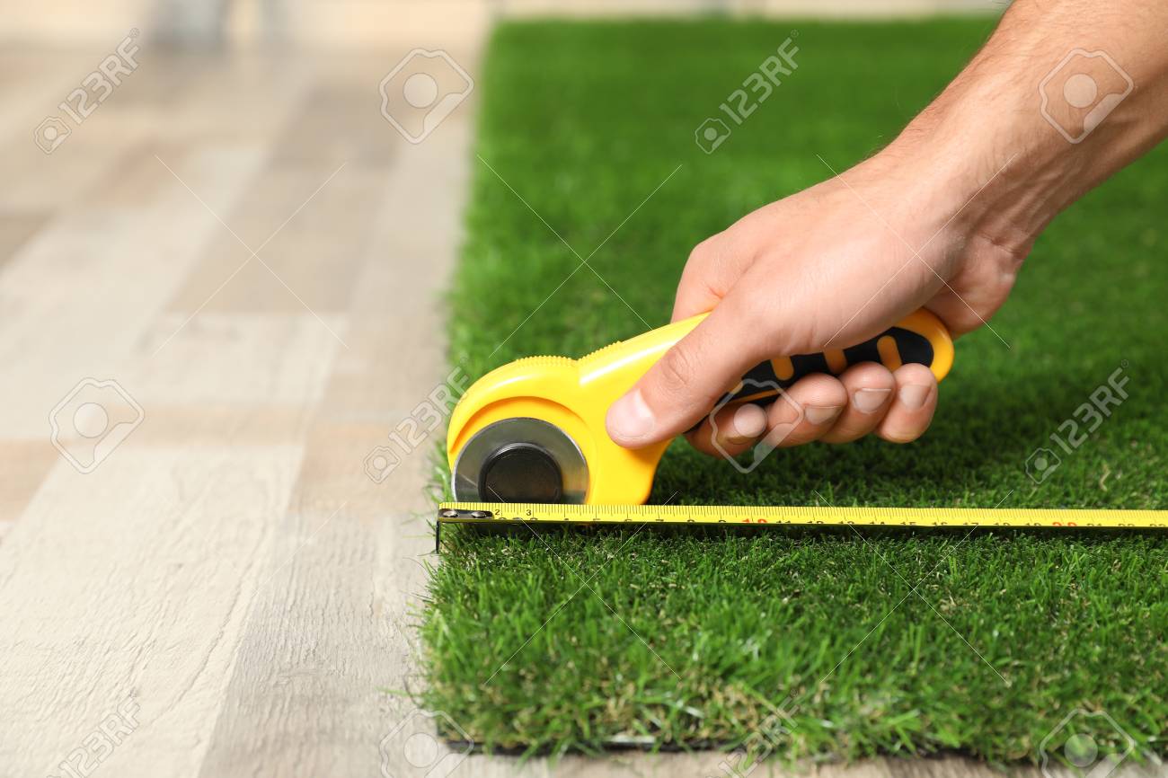 Man Cutting Artificial Grass Carpet Indoors Closeup Space For