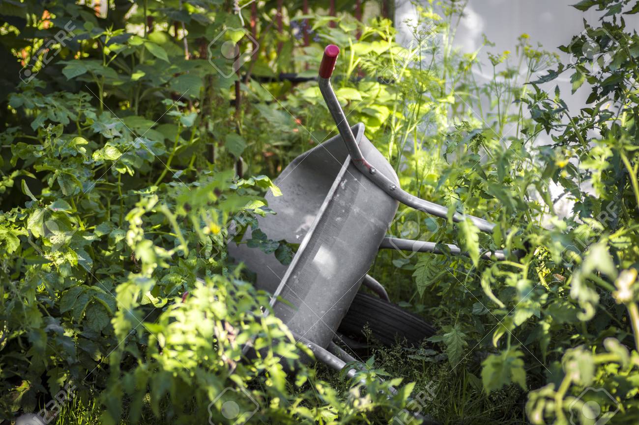 The Abandoned Garden Lies In The Bushes In The Backyard Stock