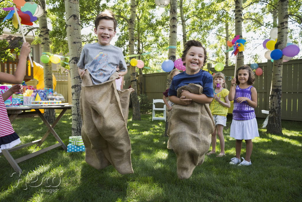 Kids Enjoying Sack Race At Backyard Birthday Party Stock Images