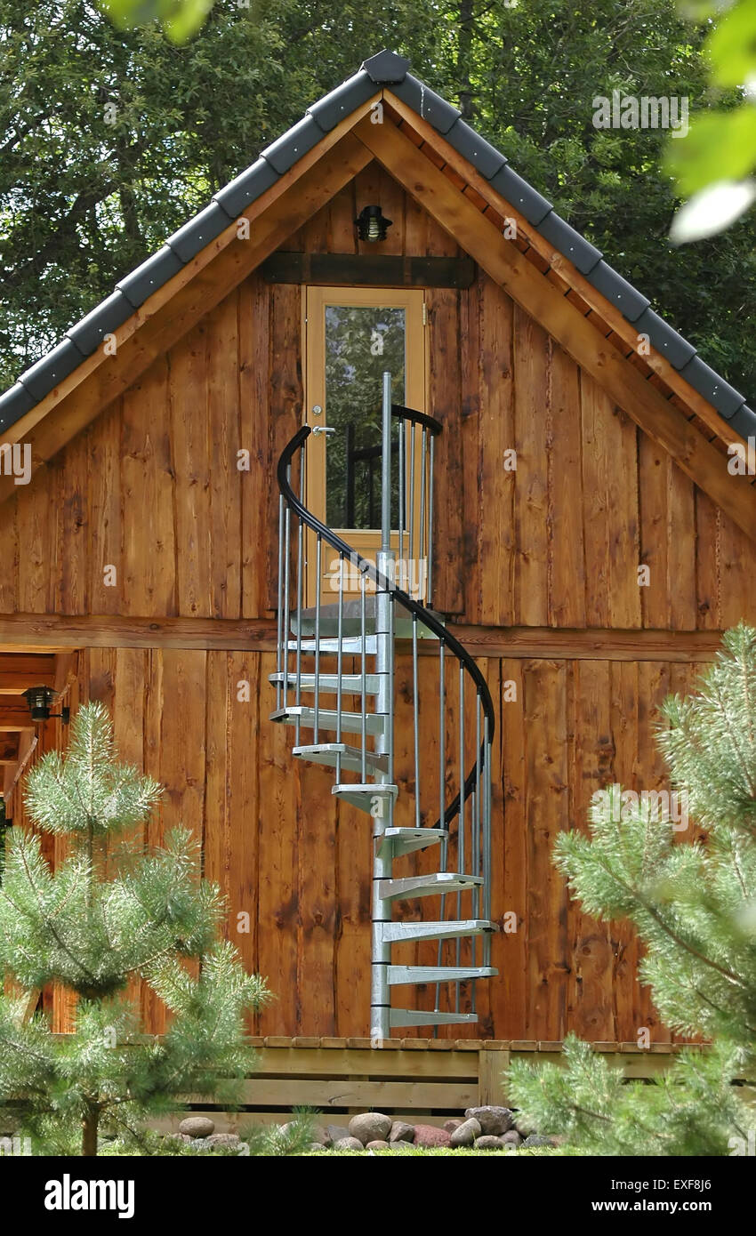 Summerhouse With Spiral Staircase At Countryside Stock Photo