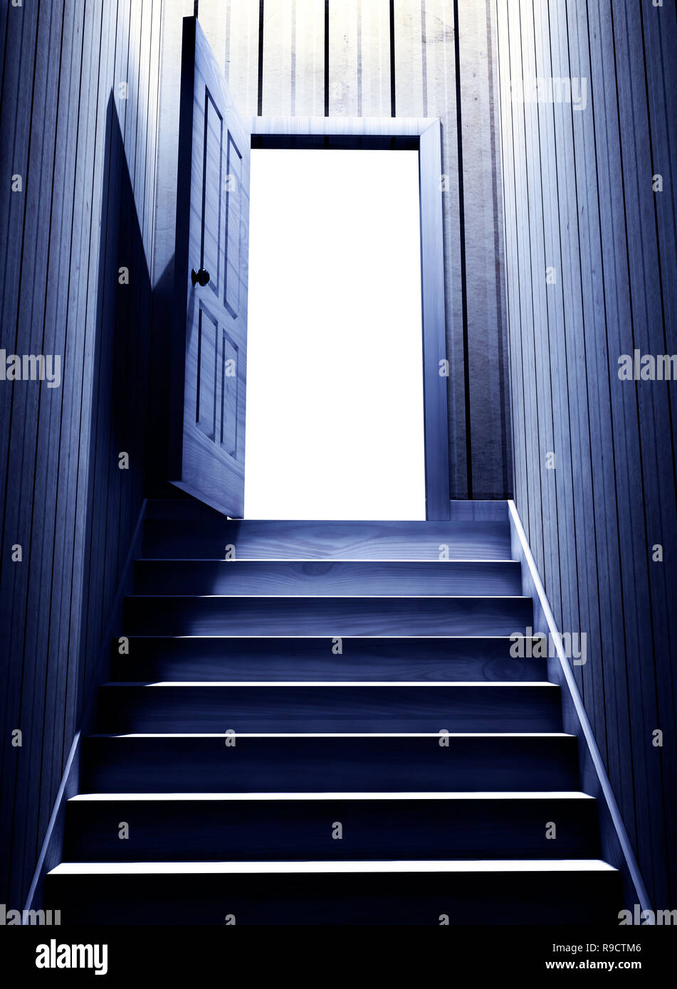 Steps Leading From A Dark Basement To Open The Door Stock Photo