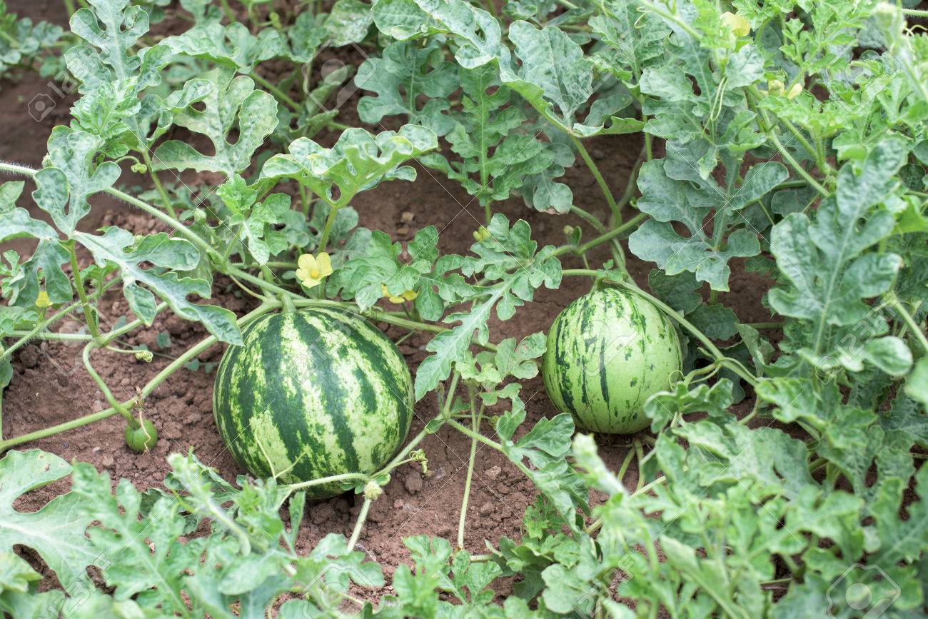 Ein Teil Der Wassermelone Pflanze Mit Der Ernte Und Bluten Lizenzfreie Fotos Bilder Und Stock Fotografie Image 62896900
