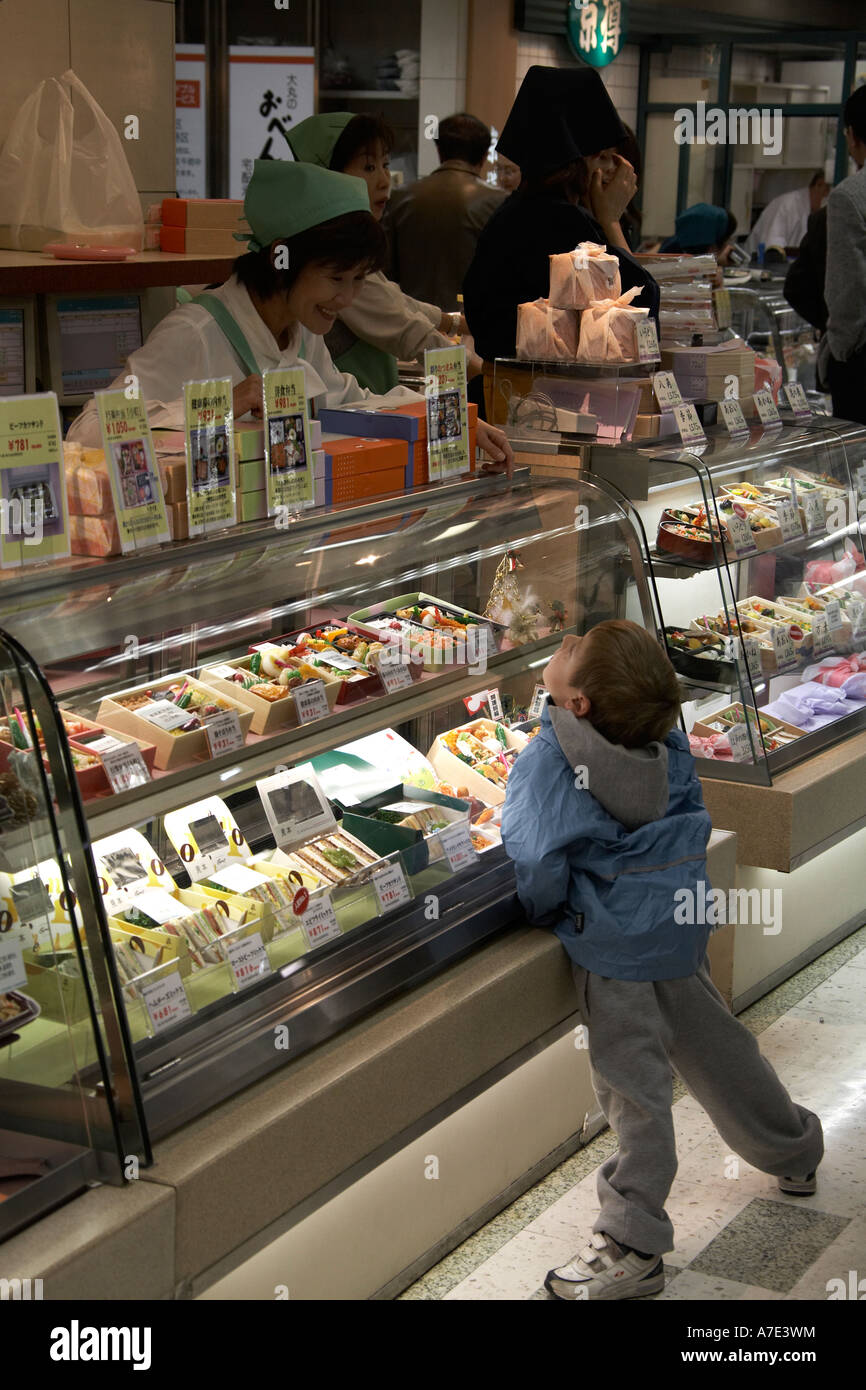 Shops With Young Western Boy Talking To Assistant In Tokyo Station